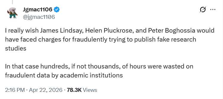 Lmao some people are still really mad about the Grievance Studies Affair and its hilarious papers. Who could believe it? Of course, we can see these people are not particularly bright, but that's no surprise. Just part of the entertainment.