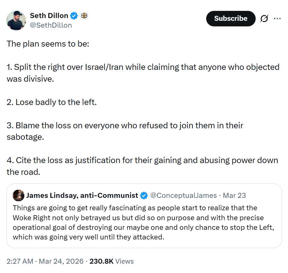 The fifth columnists in the Woke Right are using this dynamic to recruit and to drive wedges that undermine their political targets, particularly the United States itself and its conservative movement and institutions therein.