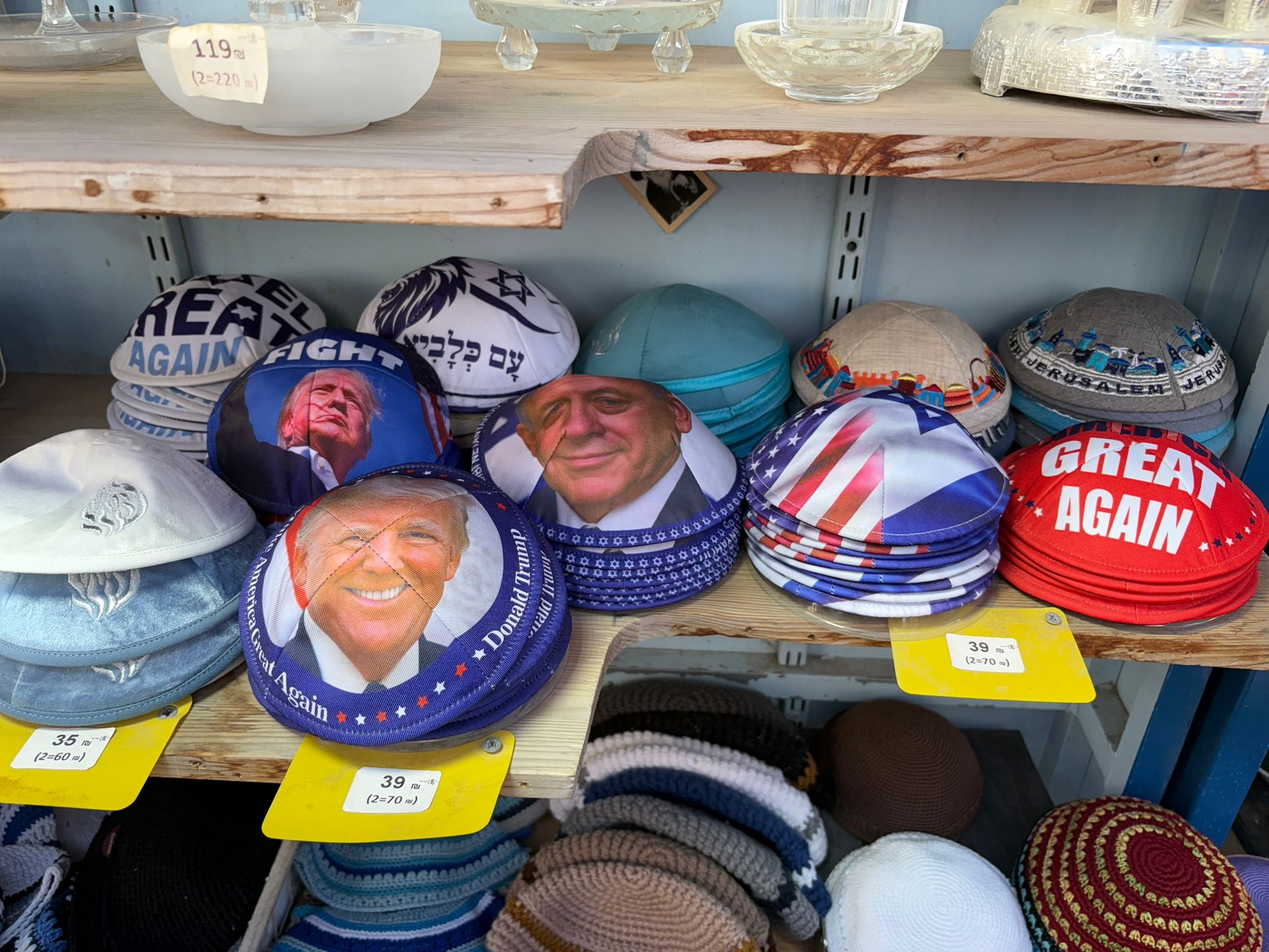 I was looking at this stand in the shuk in Jerusalem, and an Israeli man came up to us and said, "these are good, protect your head from the rockets."