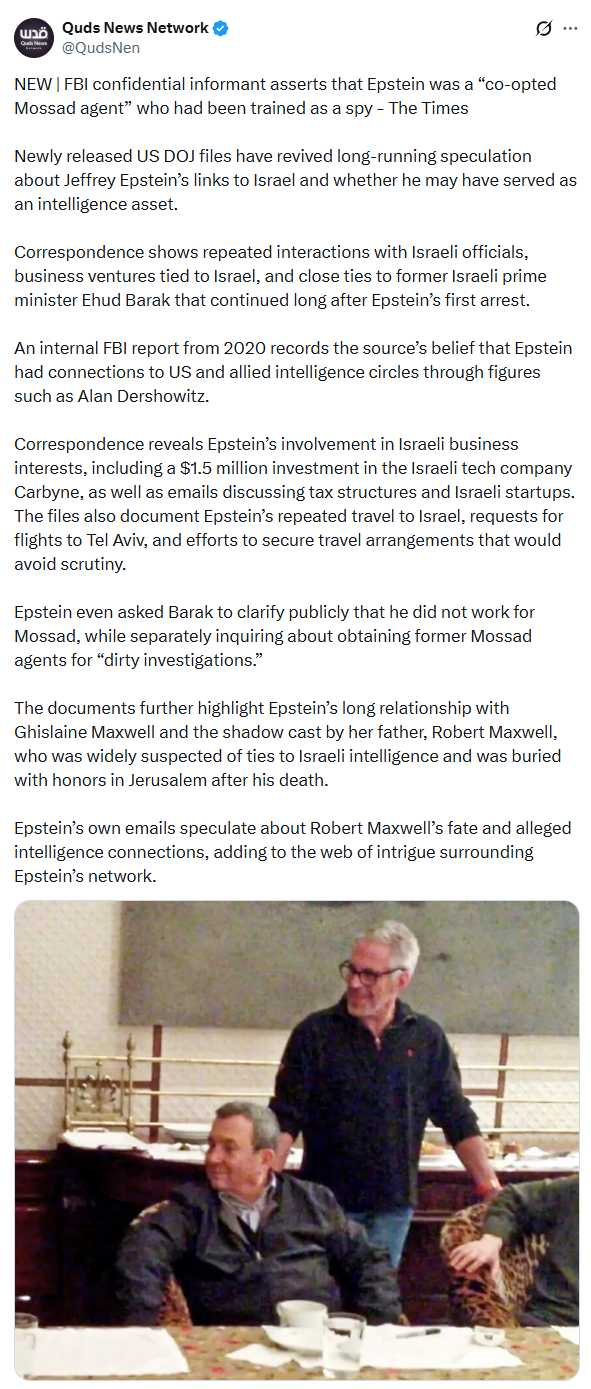 Using Epstein's ties to Barak to make out that he was working for Israel is rank propaganda. Netanyahu himself was calling out their relationship unequivocally years ago. Arguably Barak was working with Epstein AGAINST Israel, in fact, because Barak wanted power back, inter alia.