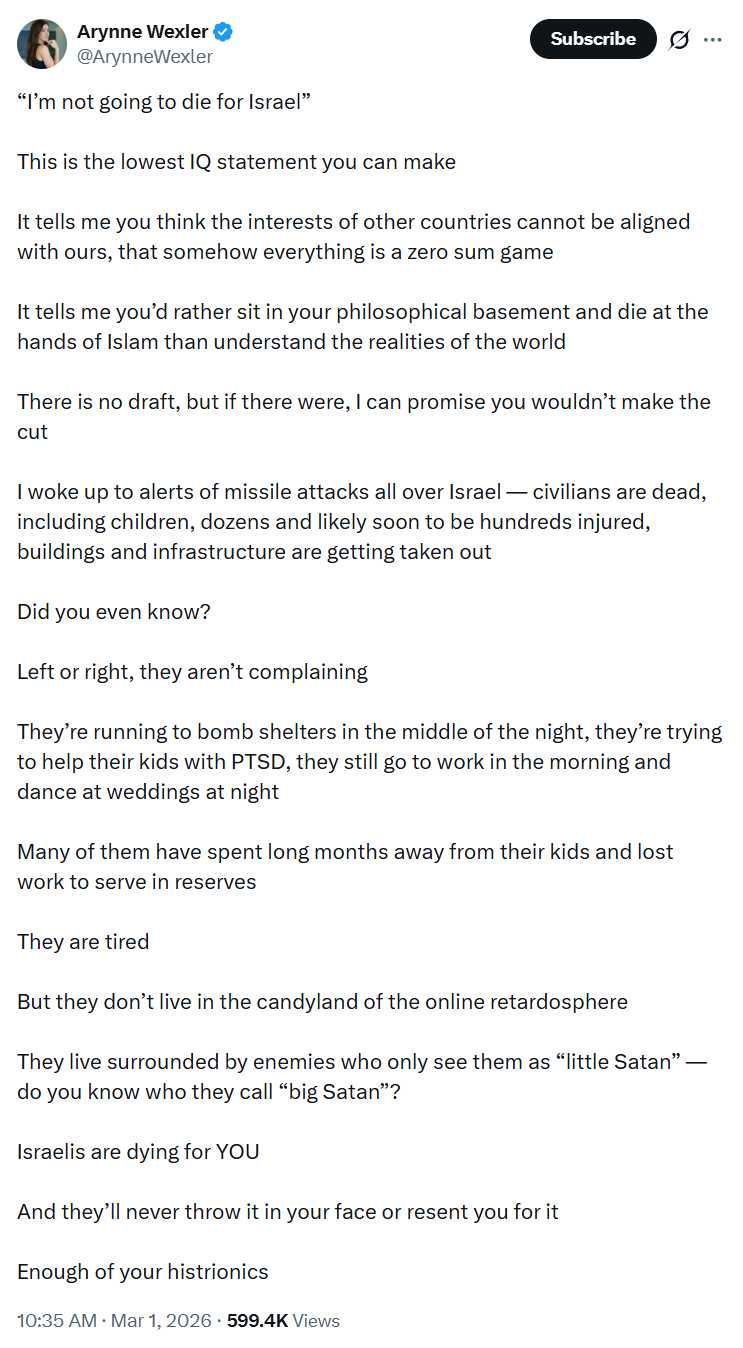 The IRGC (Iran's existing military, or what's left of it) cannot win this war by any military means, and they know it. They have exactly one play left, then, which is to play a global propaganda game. Their greatest asset in this game is the American Woke Right (Podcastistan).